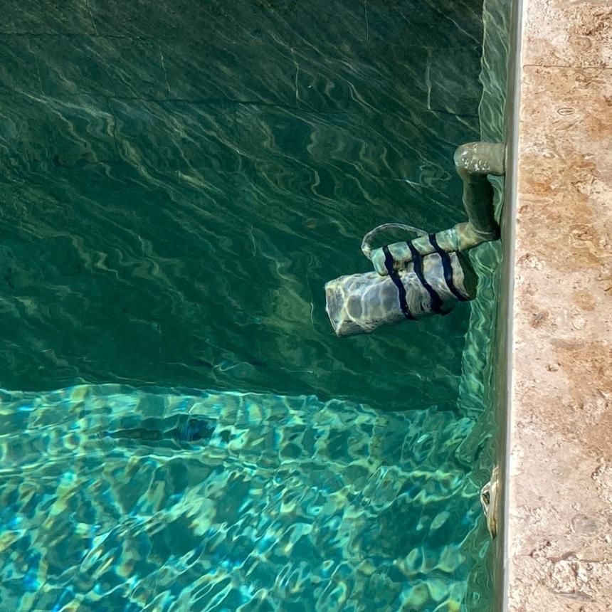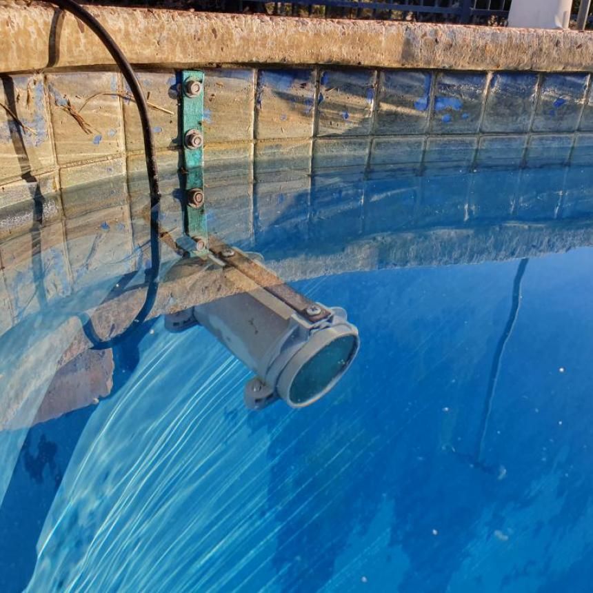 As you’ll see, I made a copper bracket and dyna-bolted it to pool wall. You’ll note in the video there is a slight bit of ‘green’ on some of the floor/walls. This now seems to have gone. In coming days I’ll send you some more photos/video of a ‘cleaner’ looking pool. So, it all appears to be working fine.  Blue light flashes and an audible clicking sound in the water.  And the temporary off button works fine.